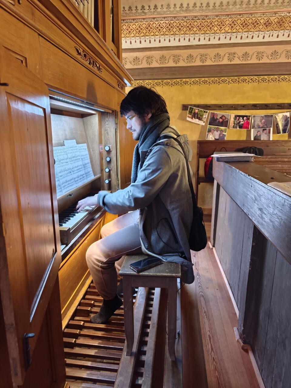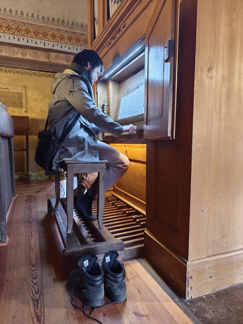 Natürlich sagte ich zu und antwortete ihm. Heute trafen wir uns in der bitterkalten Kirche. Alexander, ein sehr höflicher und freundlicher junger Mann, machte zahlreiche Fotos unserer Orgel. Als ich ihm anbot, nicht nur zu fotografieren, sondern auch selbst zu spielen, ließ er sich nicht lange bitten. Bald erfüllte Musik von Johann Sebastian Bach den Kirchenraum – seinem Lieblingskomponisten. Nebenbei erzählte Alexander, dass er bereits vor seinem Studium in seiner Heimat Russland Orgeln repariert hatte.