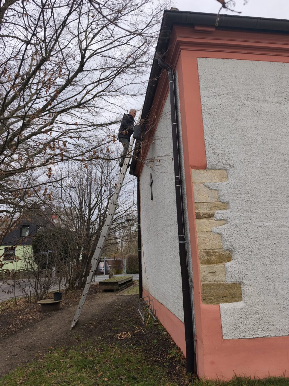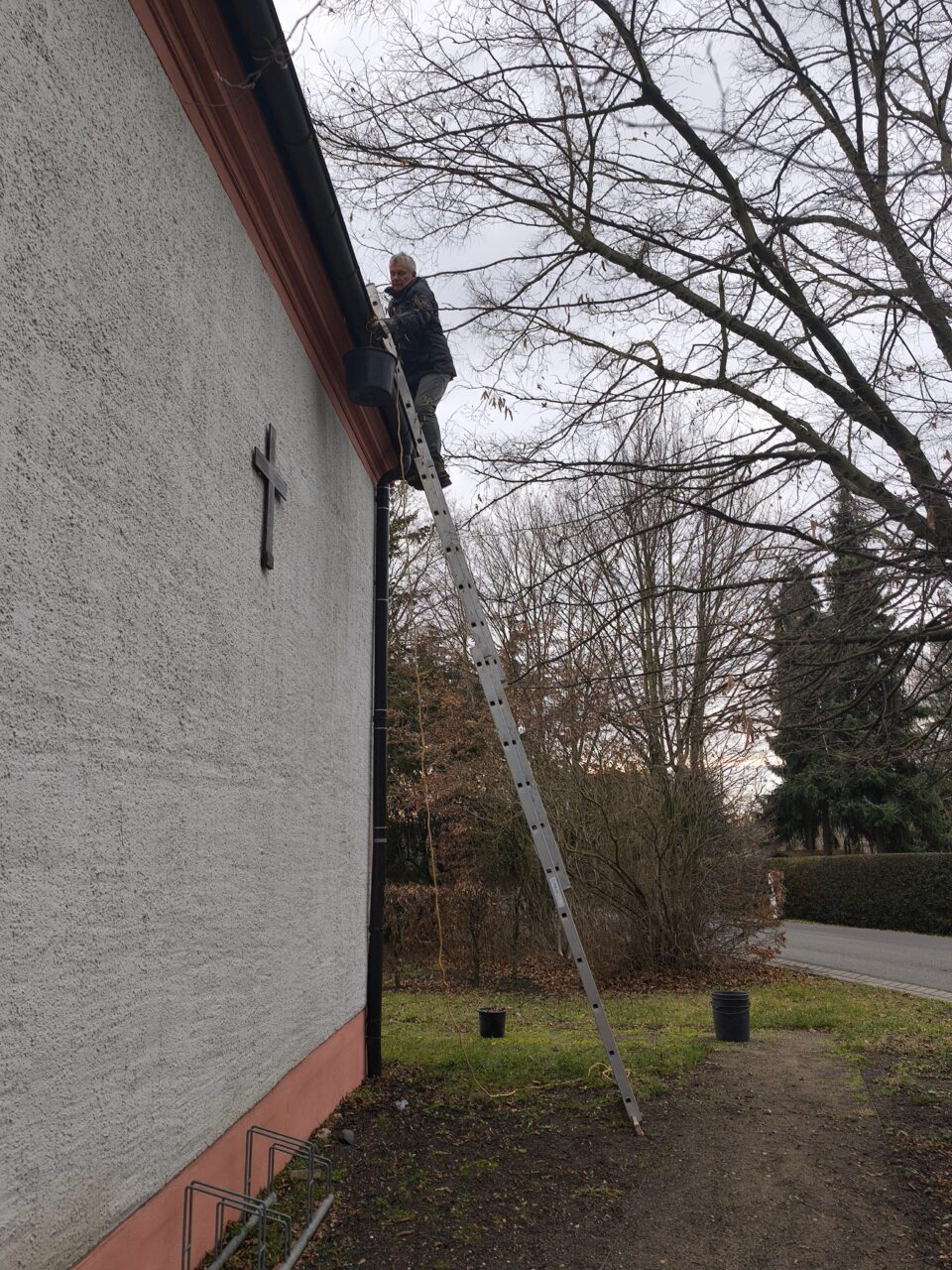 Einmal im Jahr heißt es bei uns: Dachrinnen sauber machen. Jürgen und ich, mittlerweile ein eingespieltes Team, haben uns ans Werk gemacht.
